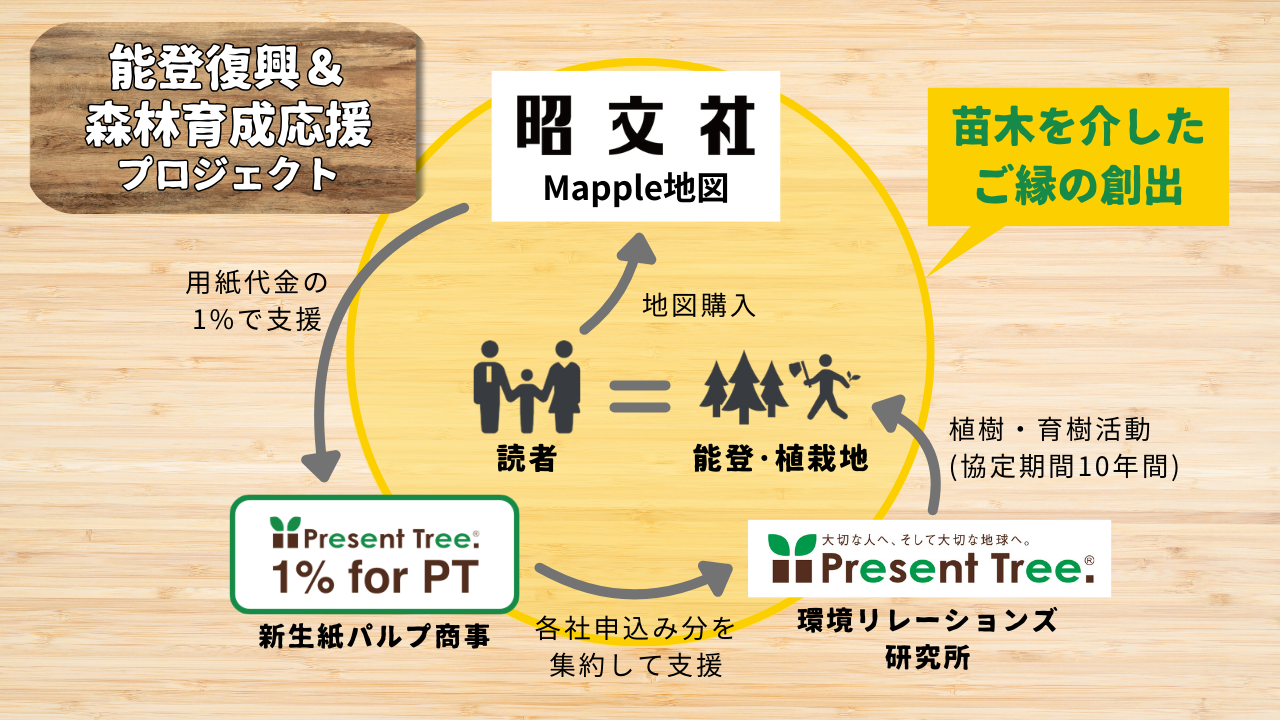 私たち昭文社は、創業以来、正確で分かりやすい地図の提供を通じて「人と地域」をつないできました。しかし、私たちがこれまで地図に描いてきた能登の美しい景観や豊かな里山、そして温かな人々の暮らしは、2024年の発災以降、いまもなお多くの困難に直面しています。