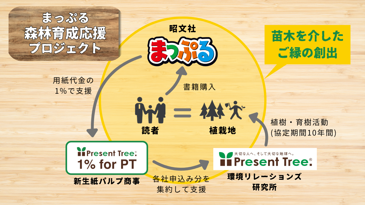 本プロジェクトの持続可能性を支えているのは、出版事業と連動した支援スキームです。2022年9月より、旅行ガイドブック「まっぷるマガジン」シリーズにおいて、用紙購入代金の1%相当額を積み立て、森林育成活動を支援する「1% for Present Tree」に参画しています。