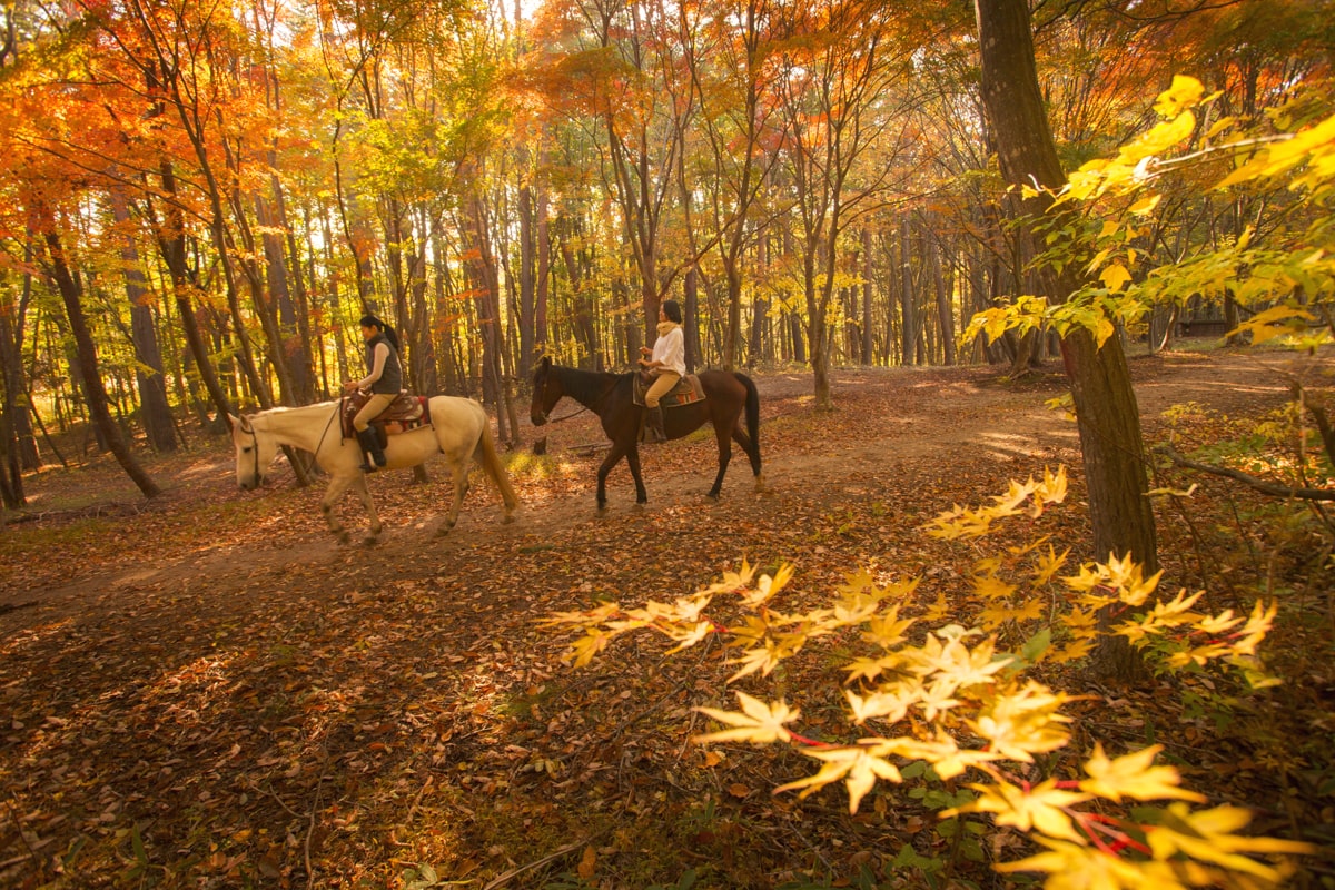 この季節ならではの体験はリゾナーレ八ヶ岳の「体験乗馬」でしょうか。赤、オレンジ、黄色と自然のままの美しい紅葉の森での乗馬はこのうえなく贅沢だなと思います。